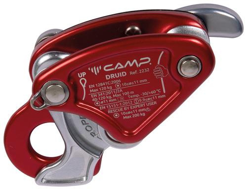 A lightweight, compact self-braking descender for rope access and rescue designed for semi-static ropes ranging from 10-11 mm. Anti-panic function in the lever re-engages the cam if the handle is pulled too far where it could lead to unsafe descent speeds. The body and lever are made of robust hot-forged aluminum alloy. Mechanical parts are made of precision-cast stainless steel. The internal mechanism and locking cam use an innovative design for smooth action on the rope which prevents rapid wear-and-tear and absorbs energy from small shocks with a slight amount of rope slippage. The fluid action on the rope also allows the Druid to function well for rope ascent. The cam can be de-activated with a trigger to allow quick sliding of the rope in situations with no load or limited load. Steel ring for attaching a keeper cord.