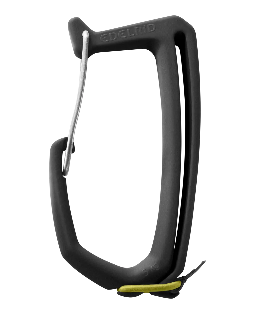 Large gear carabiner for clear storage and organisation of ice screws and other climbing equipment on the harness. Made from recycled rope material.