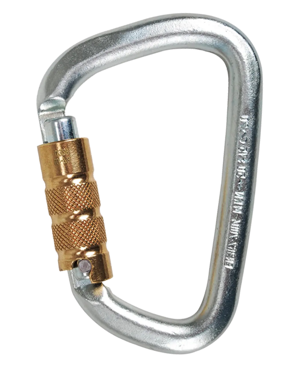 Steel carabiner with large gate opening and high safety reserve.