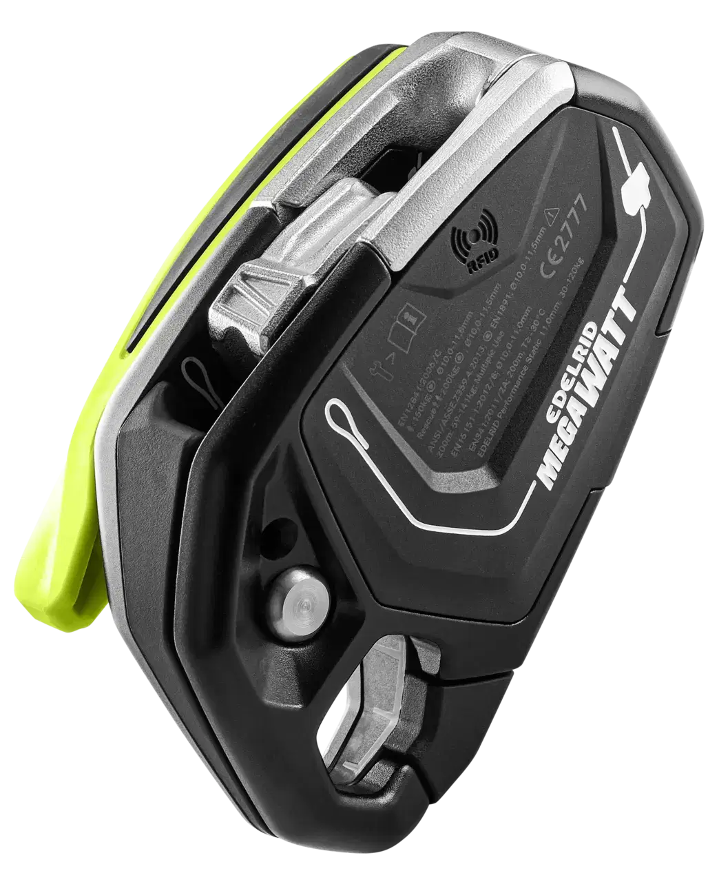 MEGAWATT is a universal descender device for industrial climbers and rescue operations with a payload of up to 230 kg. The intelligent transmission mechanics of the descent lever facilitate a large operating range and exact adjustment of the speed at minimum force.